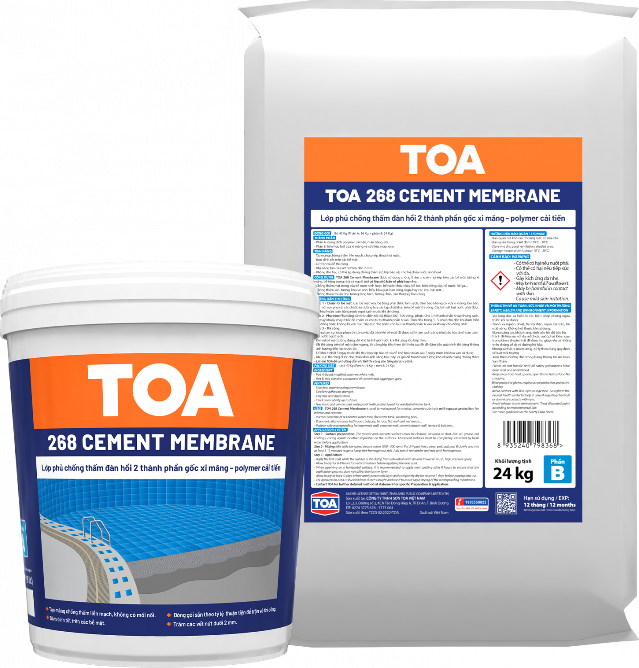 TOA 268 Cement Membrane used professionally for waterproofing on cement wall surfaces, concrete, mortar, brick, indoor and outdoor and used for new construction and renovation works such as: