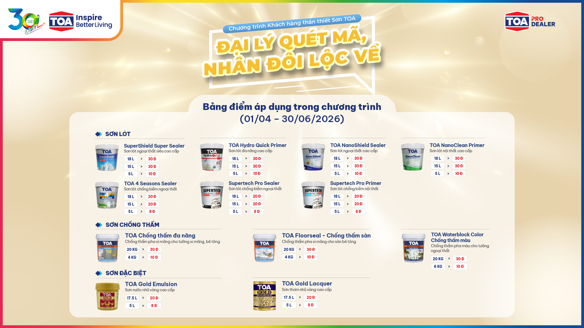 Khách hàng quét mã QR trên ứng dụng TOA.dms trong thời gian chương trình này sẽ nhận được điểm thưởng tương ứng với từng sản phẩm. Điểm thưởng sẽ được cộng dồn cùng với chương trình Khách hàng thân thiết Sơn TOA năm 2026 và được quy đổi thành tiền chuyển vào tài khoản theo thông tin tài khoản Khách hàng cung cấp.