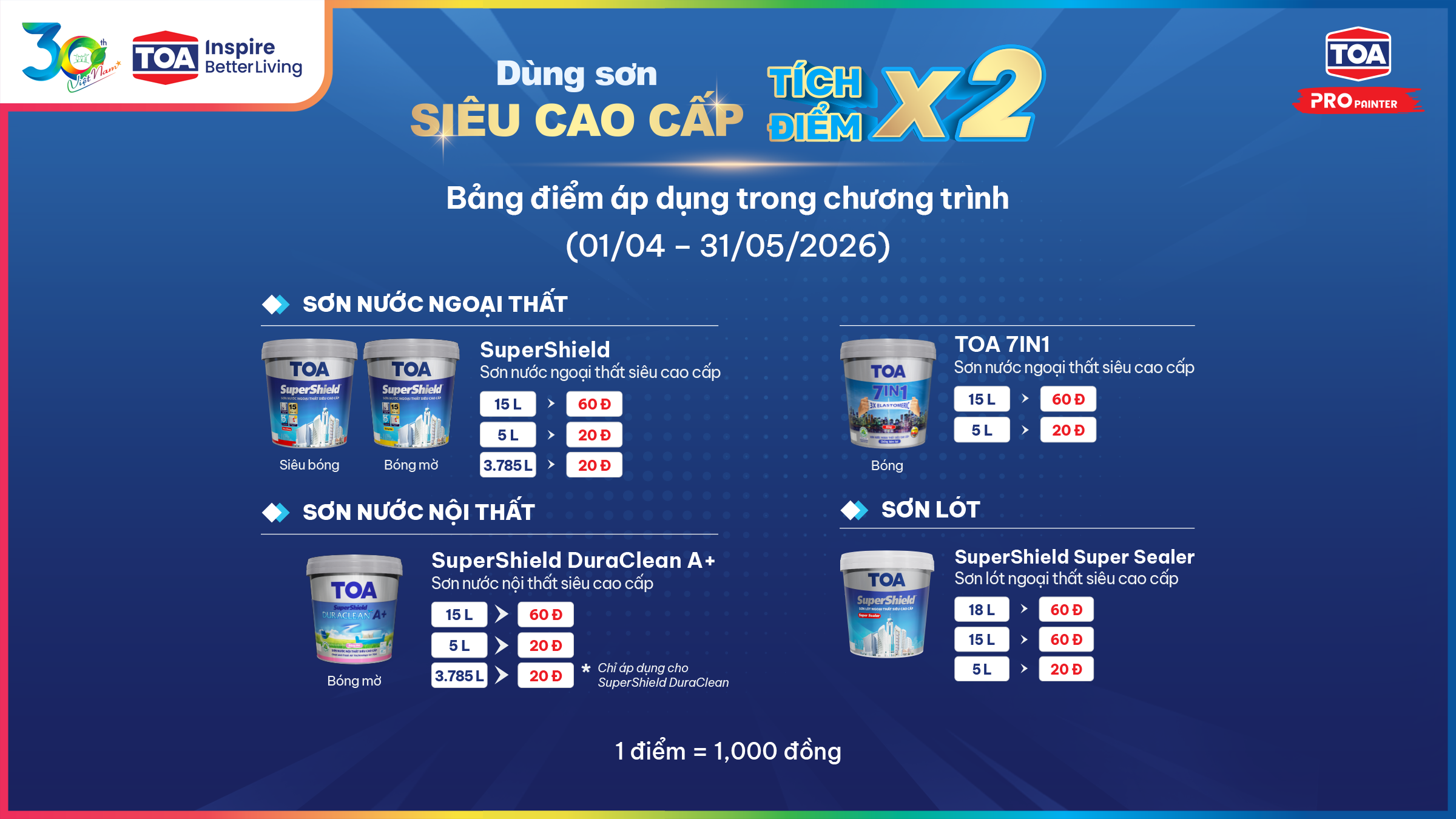 Công ty TNHH Sơn TOA Việt Nam xin chân thành cám ơn sự quan tâm và ủng hộ của Quý Hội Viên đối với Chương trình Nhà Thầu Chuyên Nghiệp Sơn TOA trong suốt thời gian vừa qua. Nay Sơn TOA Việt Nam xin trân trọng giới thiệu chương trình đặc biệt dành cho Nhà Thầu Chuyên Nghiệp Sơn TOA tháng 4 – tháng 5 năm 2026: "Dùng sơn Siêu cao cấp, Tích điểm X2" với nội dung chi tiết như sau: