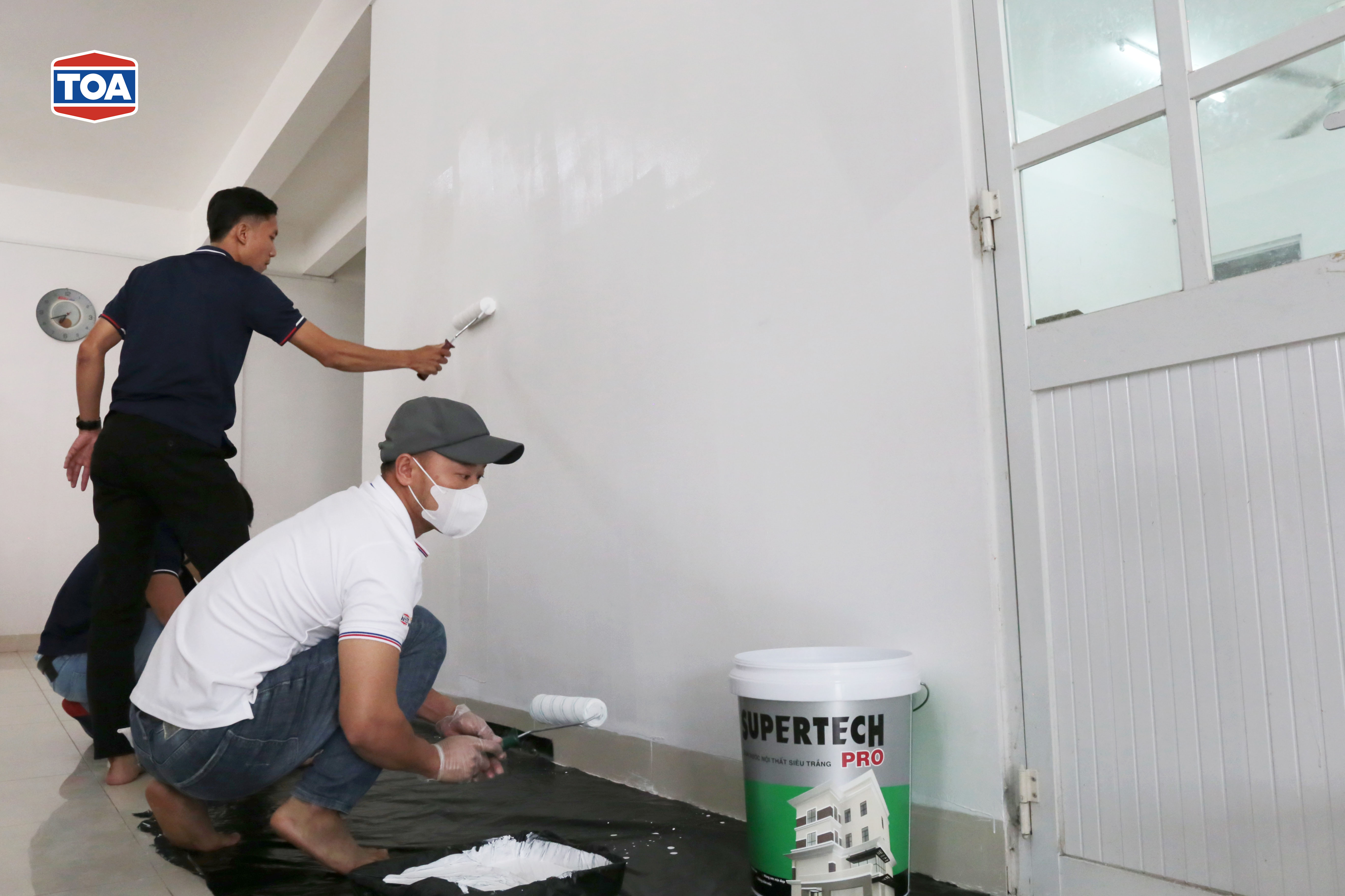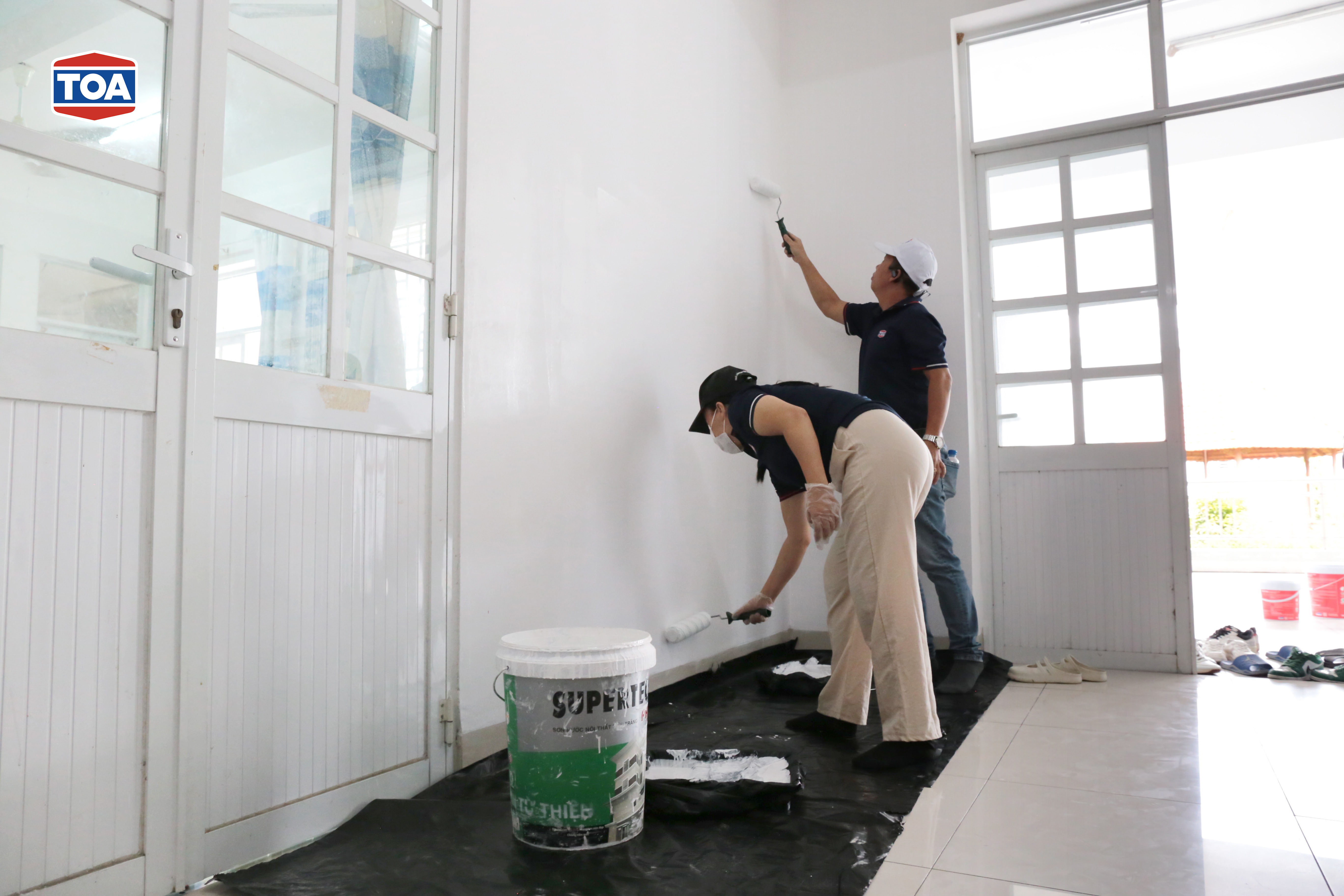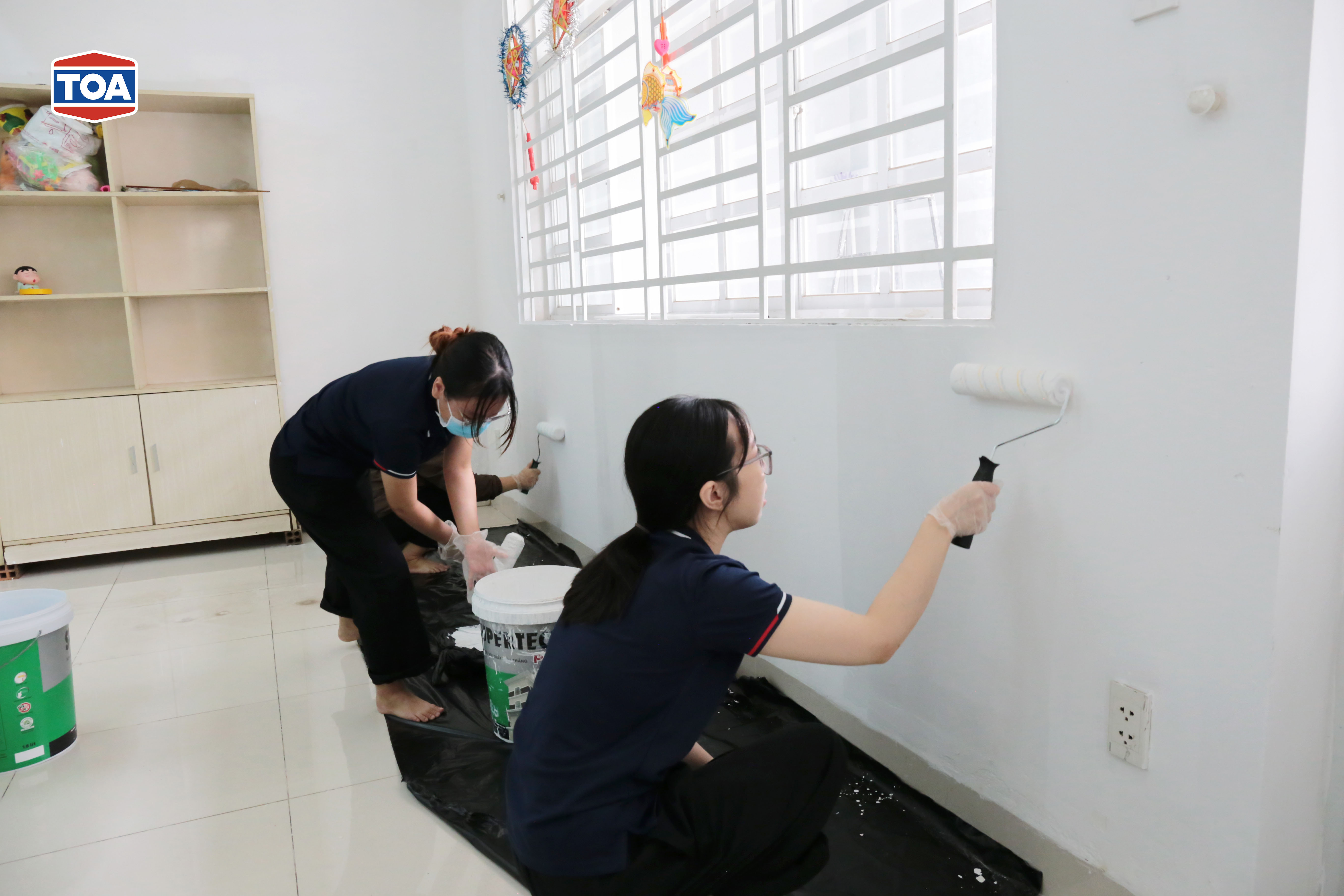 Không chỉ dừng lại ở việc trao tặng, tập thể nhân viên Sơn TOA Việt Nam đã trực tiếp tham gia lăn sơn, làm mới không gian sinh hoạt cho các em nhỏ. Những mảng tường cũ kỹ được khoác lên màu áo mới tươi sáng, mang lại diện mạo khang trang và tràn đầy sức sống.