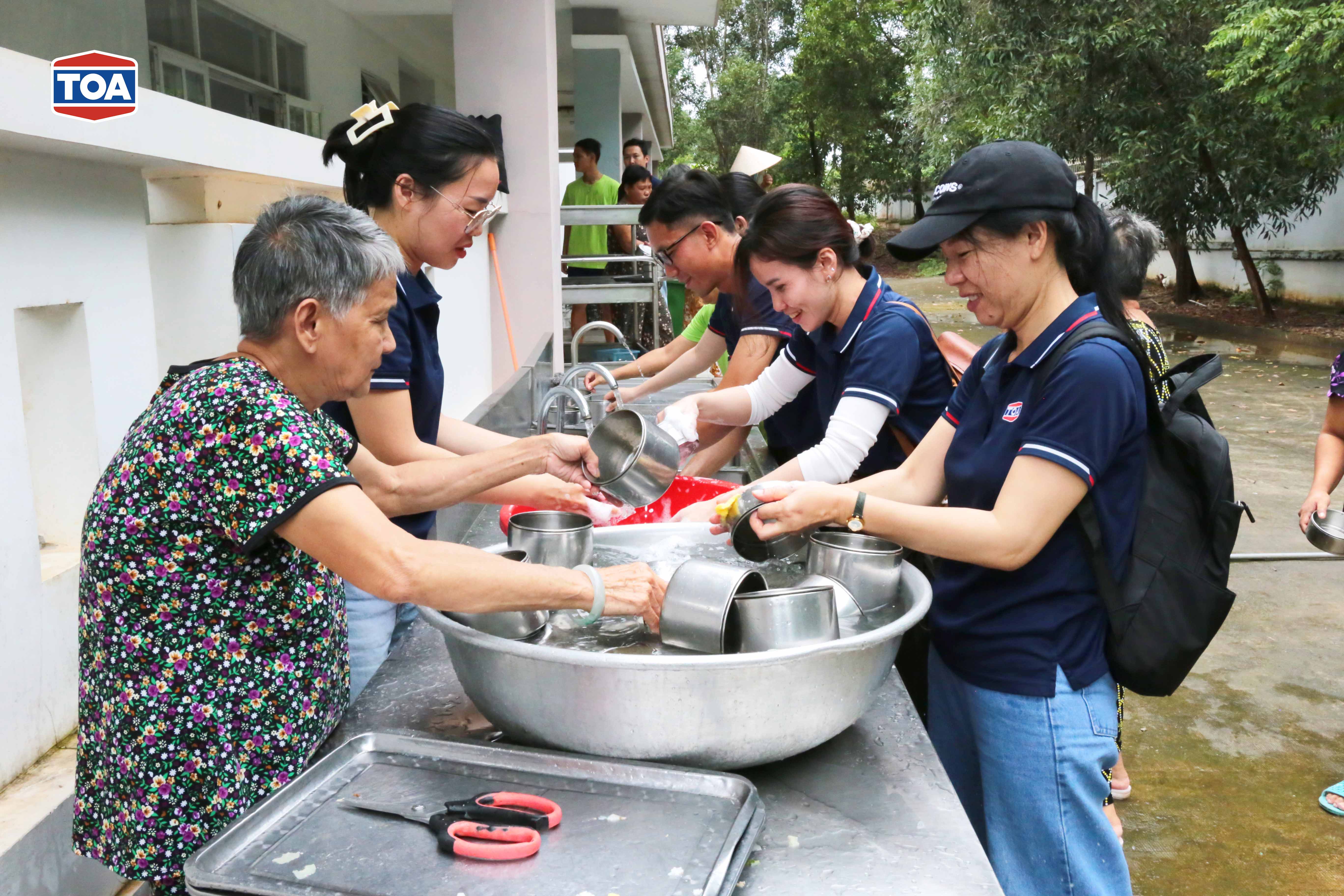 Song song với đó, đoàn còn dành thời gian gặp gỡ, thăm hỏi các em nhỏ có hoàn cảnh khó khăn, cũng như những cụ già neo đơn tại Trung tâm. Những phần cơm ấm nóng được trao tận tay, những nụ cười và lời động viên chân thành đã lan tỏa không khí ấm áp, gắn kết mọi người lại gần nhau hơn.