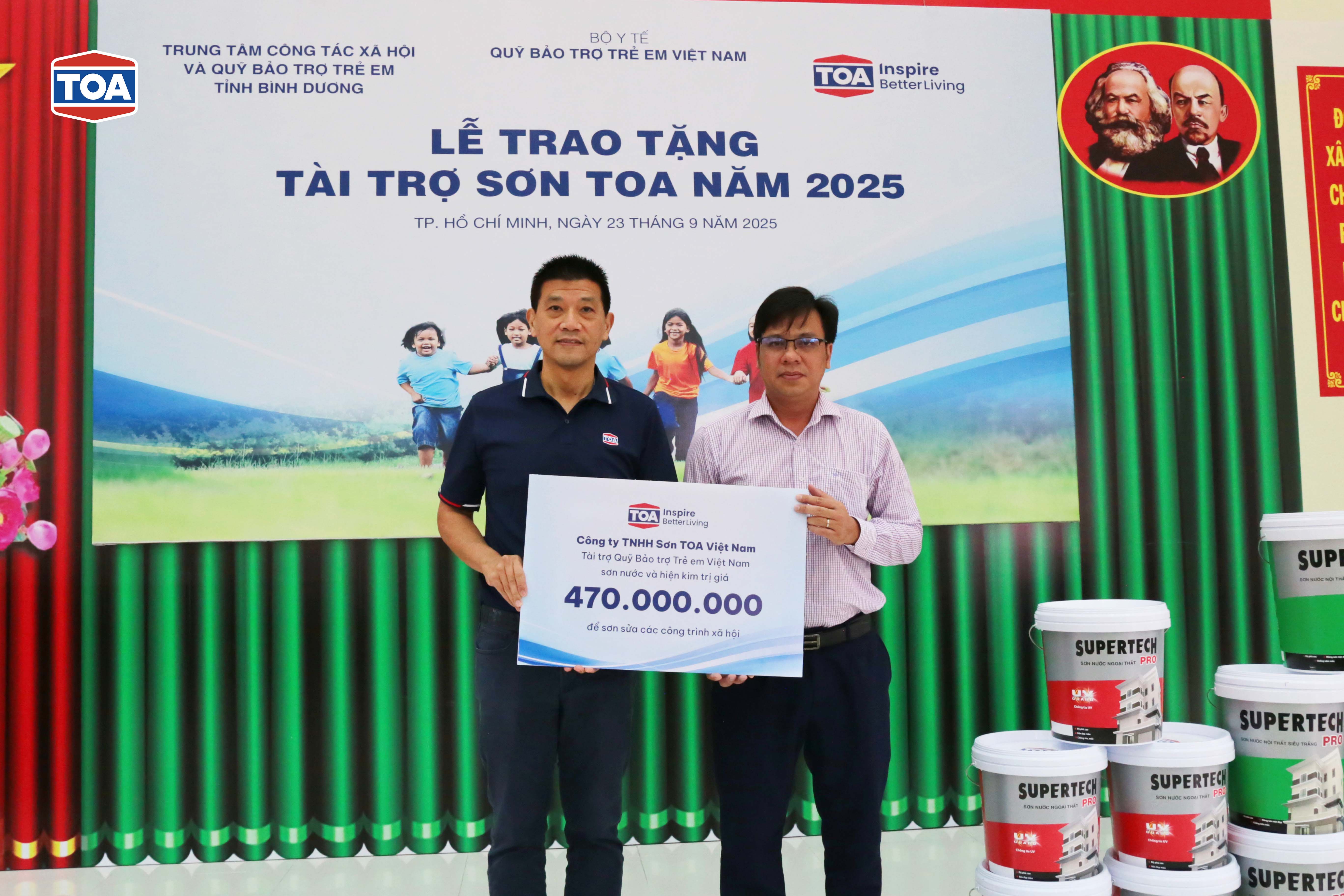 Trong khuôn khổ hoạt động lần này, Sơn TOA vinh dự trao tặng hơn 6.500 lít sơn nước Supertech Pro cùng hiện kim, với tổng trị giá 470 triệu đồng cho Quỹ Bảo trợ Trẻ em Việt Nam. Khoản tài trợ sẽ được sử dụng để sơn sửa, cải tạo các công trình trường học, trung tâm công tác xã hội,... với mong muốn góp phần xây dựng môi trường học tập và sinh hoạt an toàn, sạch đẹp hơn cho trẻ em và những người có hoàn cảnh khó khăn.