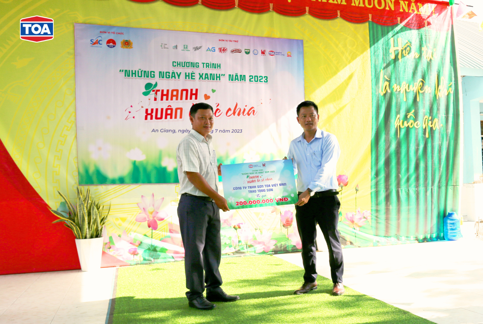 Với tổng giá trị tài trợ hơn 600 triệu đồng (bao gồm sơn nước và sơn dầu), Sơn TOA đã trích khoản tài trợ sơn trị giá 200 triệu cho 3 điểm trường trên địa bàn tỉnh An Giang (bao gồm Trường Tiểu học A Vĩnh Nhuận, A Tân Phú và “A” An Tức), với mong muốn mang đến một môi trường học tập tươi đẹp và trong lành hơn cho các em học sinh. Khoản tài trợ sơn trị giá 400 triệu còn lại sẽ được chuyển đến cho các địa điểm khác trên địa bàn tỉnh Tây Ninh, thành phố Thủ Đức, quận Bình Thạnh,… trong danh sách đề xuất của Đoàn trường.