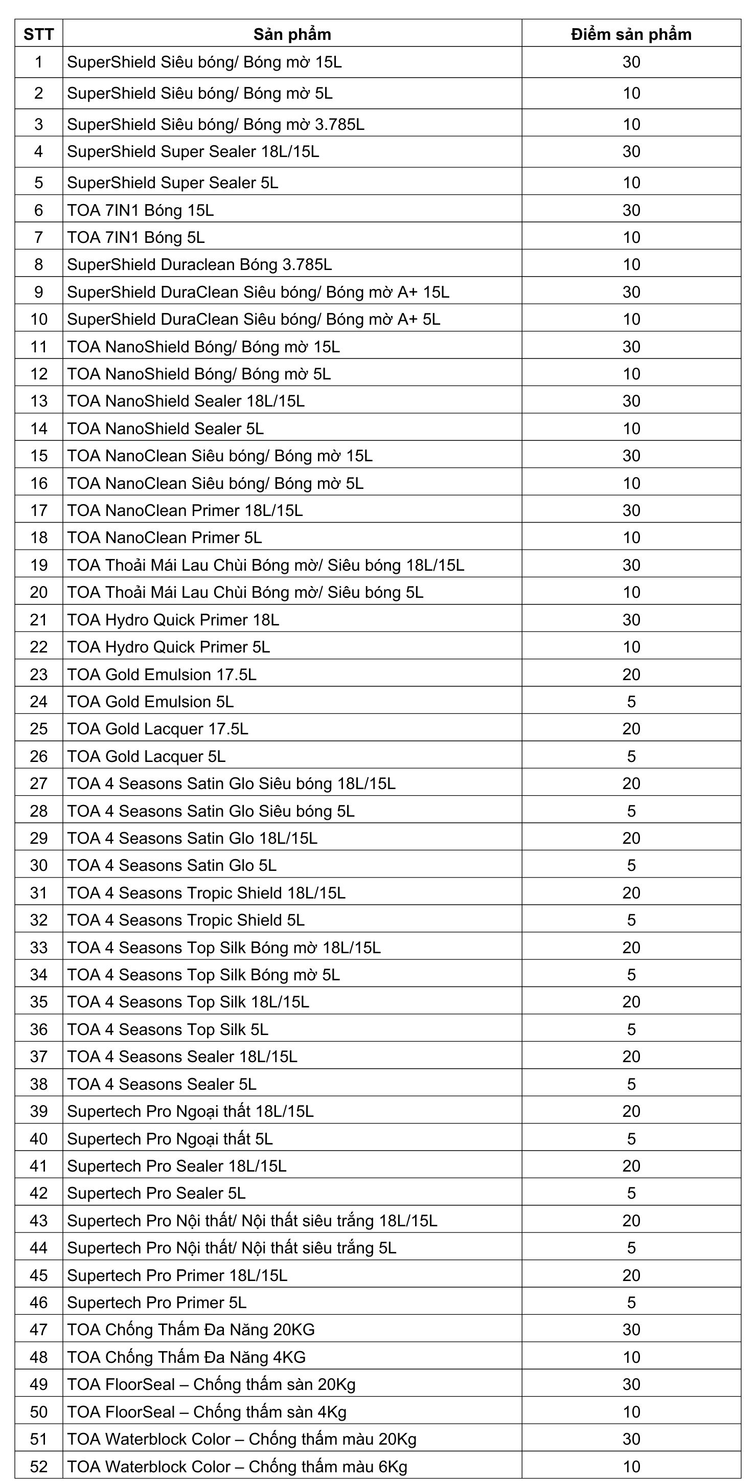 - Chỉ tính điểm cho Hội viên Nhà thầu Chuyên nghiệp Sơn TOA mua sơn tại các cửa hàng thuộc hệ thống Sơn TOA.